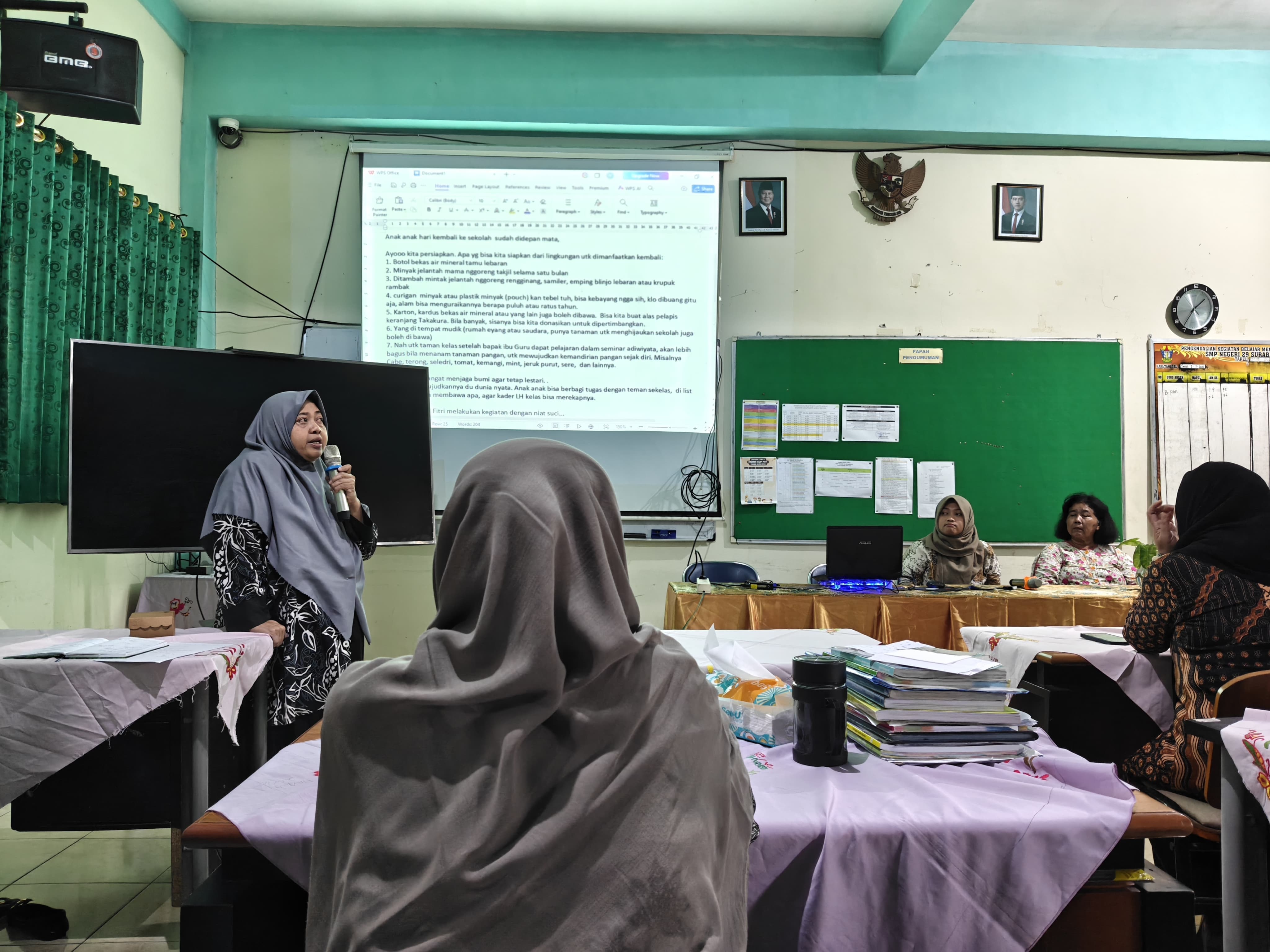 Dalam sesi tanya jawab, beberapa hal teknis turut diklarifikasi. Menanggapi pertanyaan terkait keharusan kolase foto, Ibu Rizky menegaskan bahwa foto tidak perlu dikolase agar tanggal asli pengambilan gambar tetap terbaca, serta dianjurkan menggunakan aplikasi geotagging. Sementara itu, terkait lokasi Pokja Ketahanan Pangan di area pohon jati yang kemungkinan menjadi milik UNESA, Ibu Sulastri menjelaskan bahwa selama belum ada kepastian lahan baru, area tersebut masih dapat dimanfaatkan hingga tahun ajaran baru. Ia juga menambahkan bahwa sesuai himbauan Dinas Pendidikan, setiap sekolah wajib memiliki lahan produktif, namun pengelolaannya tidak harus terpusat di satu lokasi, melainkan dapat tersebar di beberapa titik selama program tetap berjalan.
